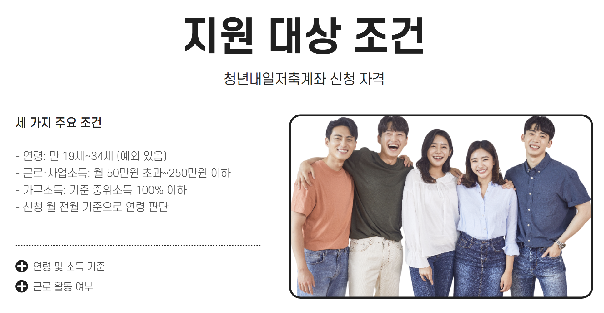 2025년 청년내일저축계좌는 아래 세 가지 조건을 모두 만족해야 신청할 수 있어요.